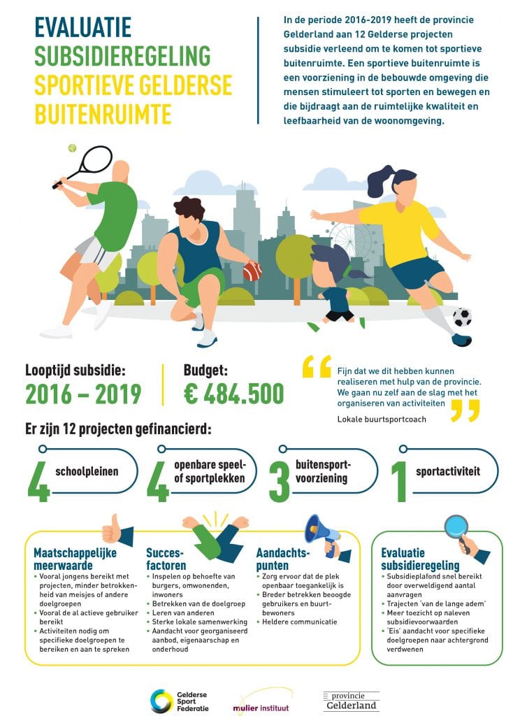 Door de openbare ruimte sportvriendelijk in te richten, geven we meer mensen de gelegenheid te bewegen. Maar hoe doe je dat op een goede manier? Het Mulier Instituut heeft in samenwerking met de Gelderse Sport Federatie twaalf Gelderse projecten onderzocht. Het rapport bevat onder meer succesfactoren en praktische leerpunten.